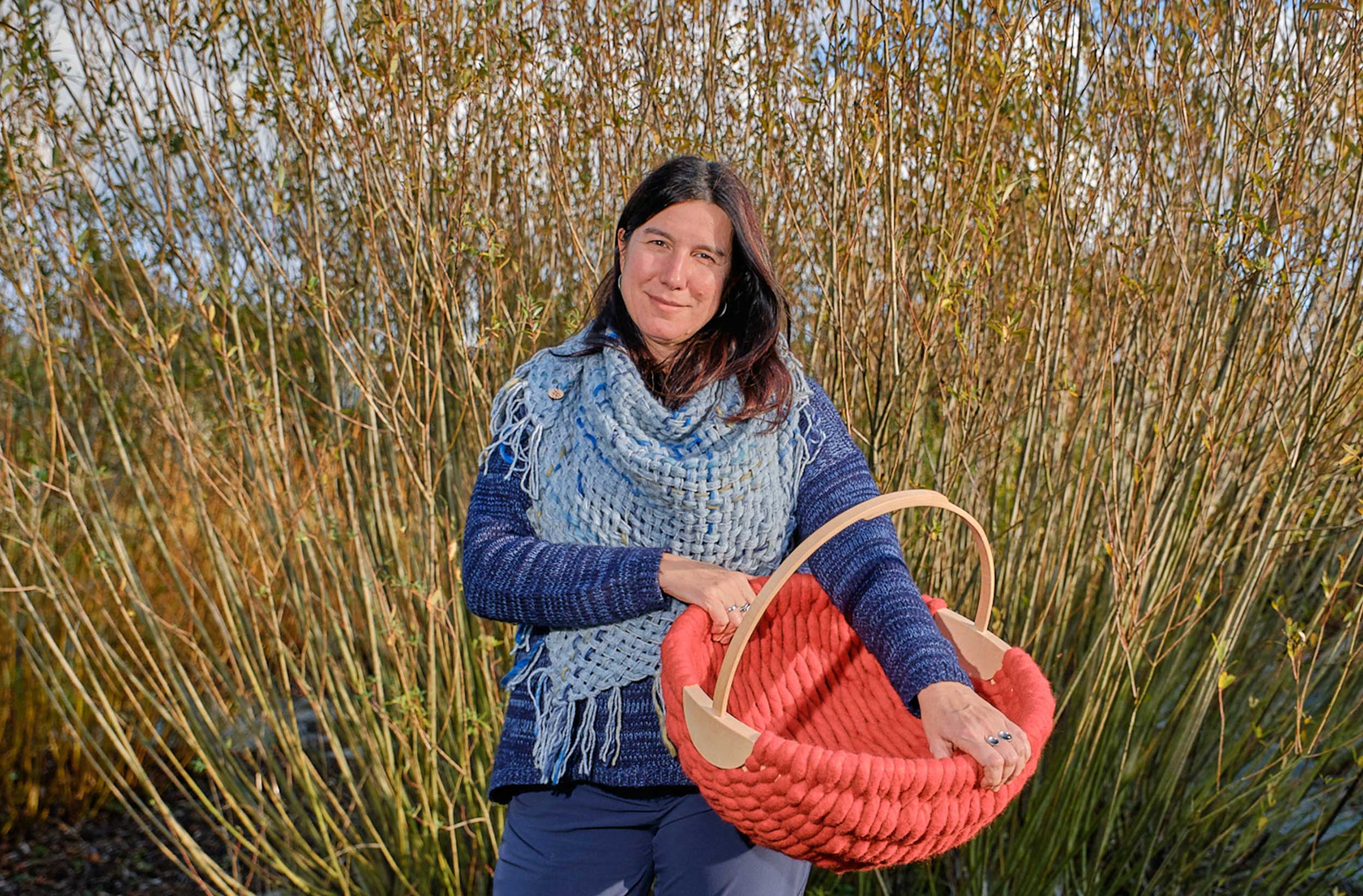 En este entorno natural los mimbres que cultivo o las cigüeñas que tejen sus nidos inspiran su creatividad y le ofrecen “la oportunidad de crear piezas sostenibles, con formas orgánicas que transmiten la nobleza y calidez de las materias primas que utilizo”.